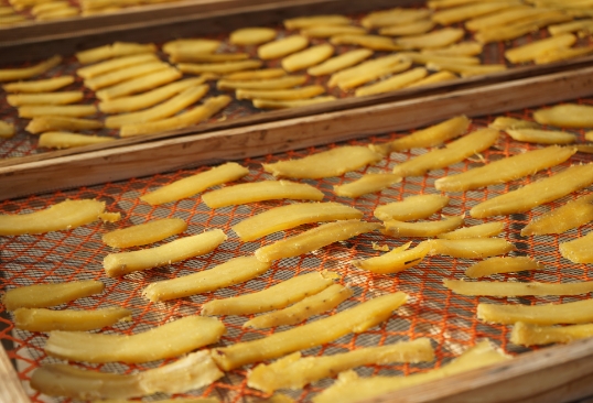 事業所内では、心を込めて本格的な石焼き芋や干し芋、とうもろこしなどを丁寧に手づくりしています。ご注文をいただいてから焼き上げ、できたての温かさと香ばしさをそのまま地域の方へお届けしています。道の駅でも販売しており、ホクホク甘い季節の味わいを楽しみに足を運んでくださるお客様も多くいらっしゃいます。